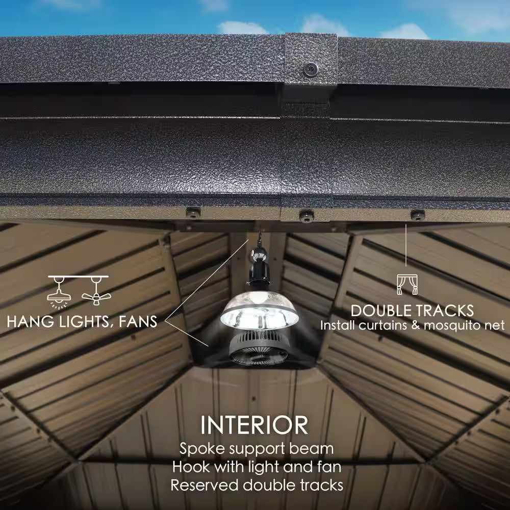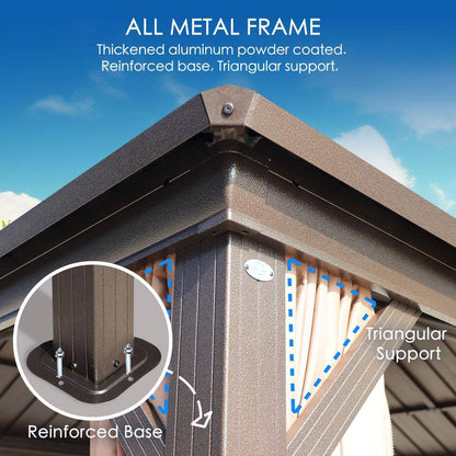 Experience the ultimate outdoor luxury with the Kozyard 10'x12' Hardtop Gazebo. This gazebo is a perfect addition to your patio, backyard, deck, and lawns. With its galvanized steel outdoor aluminum canopy, it provides a robust and stylish shelter that will stand the test of time. The gazebo is designed with a double roof pergola style, offering a unique aesthetic and excellent ventilation. It's a permanent metal pavilion that provides a perfect space for outdoor dining, parties, and relaxationThe hardtop gazebo comes with netting and shaded curtains, providing protection from insects and harsh sunlight. It's a perfect outdoor gazebo for enjoying the beauty of nature while staying protected from the elements. This 10'x12' hardtop gazebo is not just functional; it's also stylish. The brown color adds a touch of elegance to any outdoor space. The gazebo is also available on clearance, offering you the best value for your money. Enjoy the comfort and luxury of a Kozyard gazebo and transform your outdoor living space